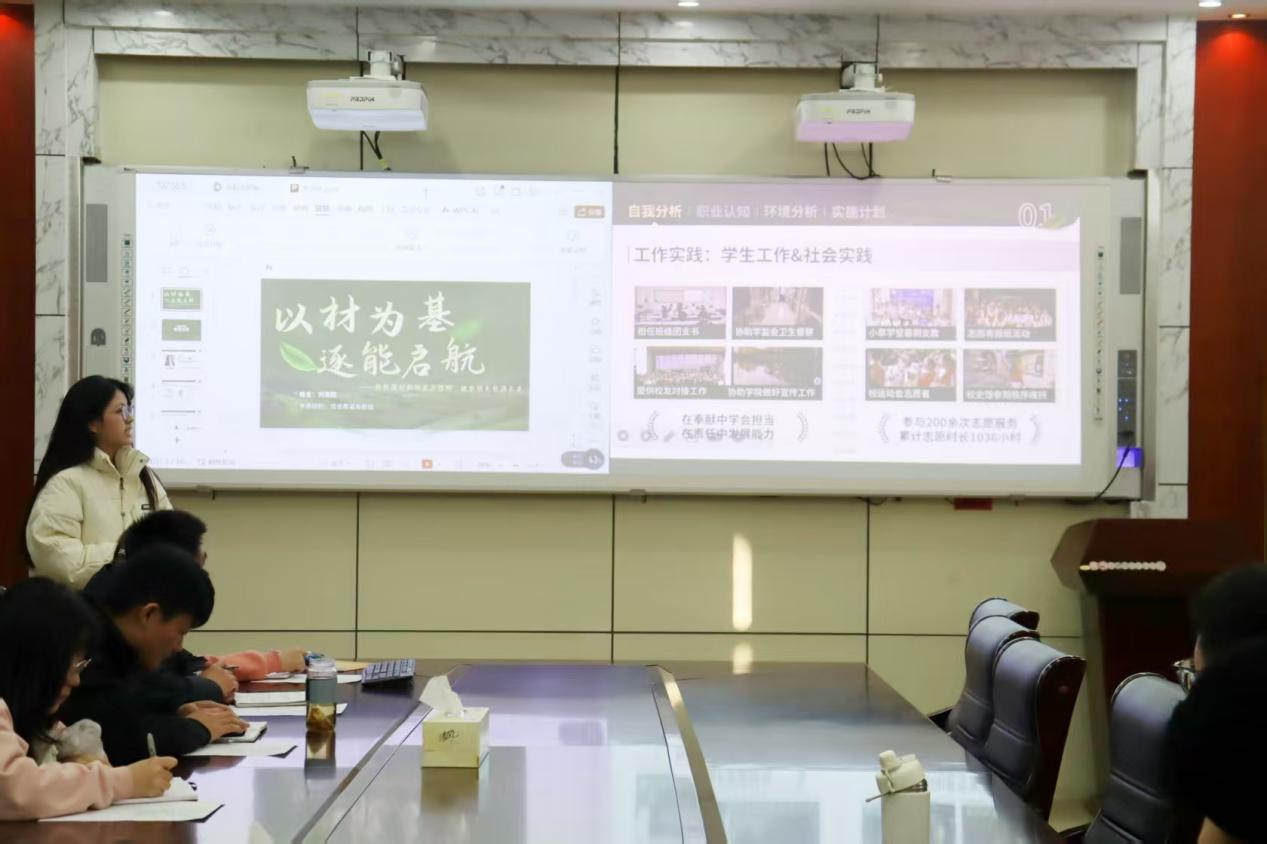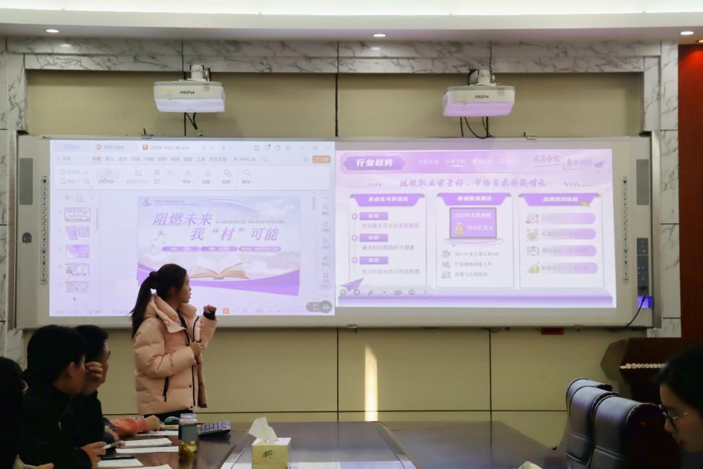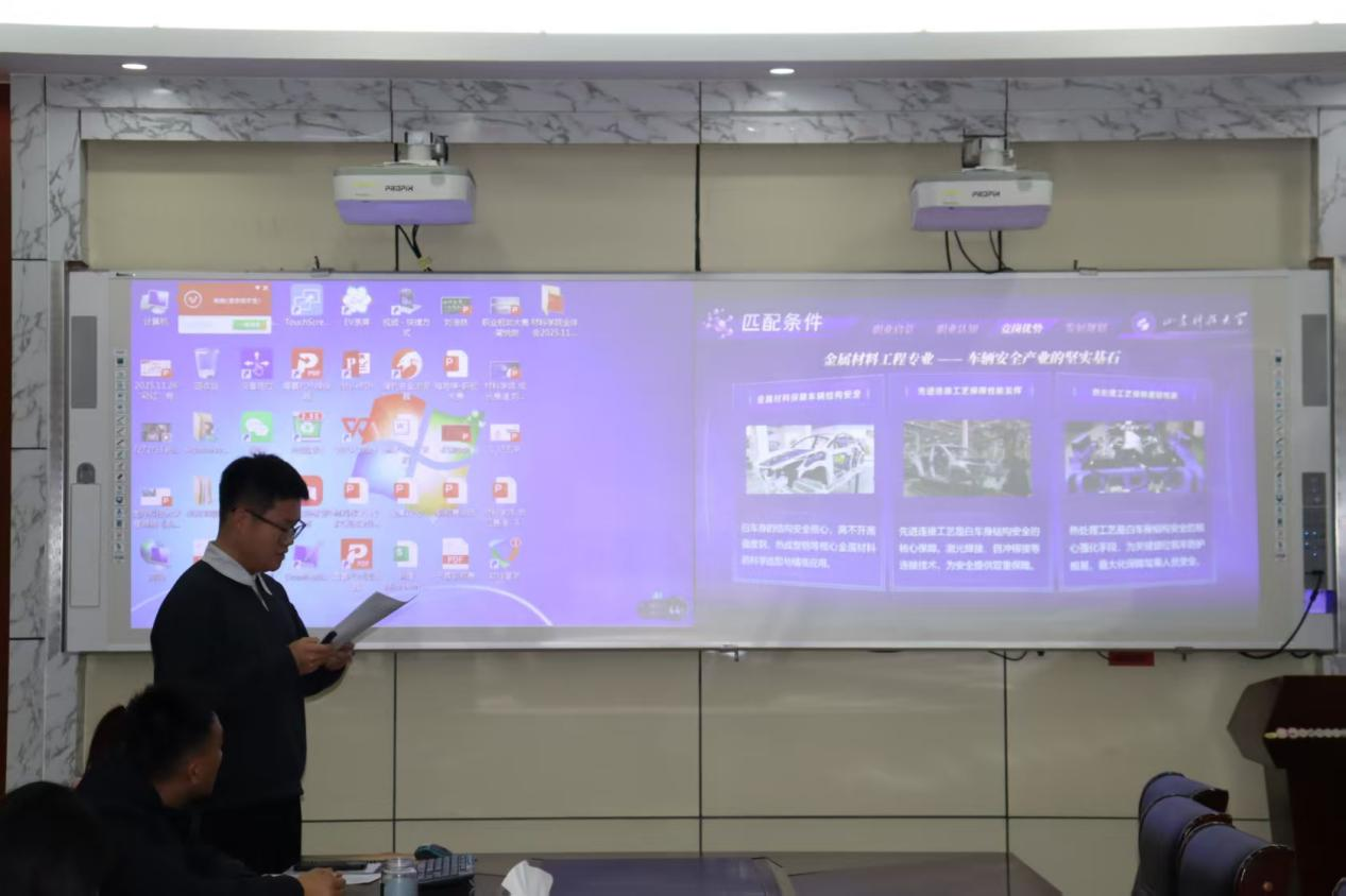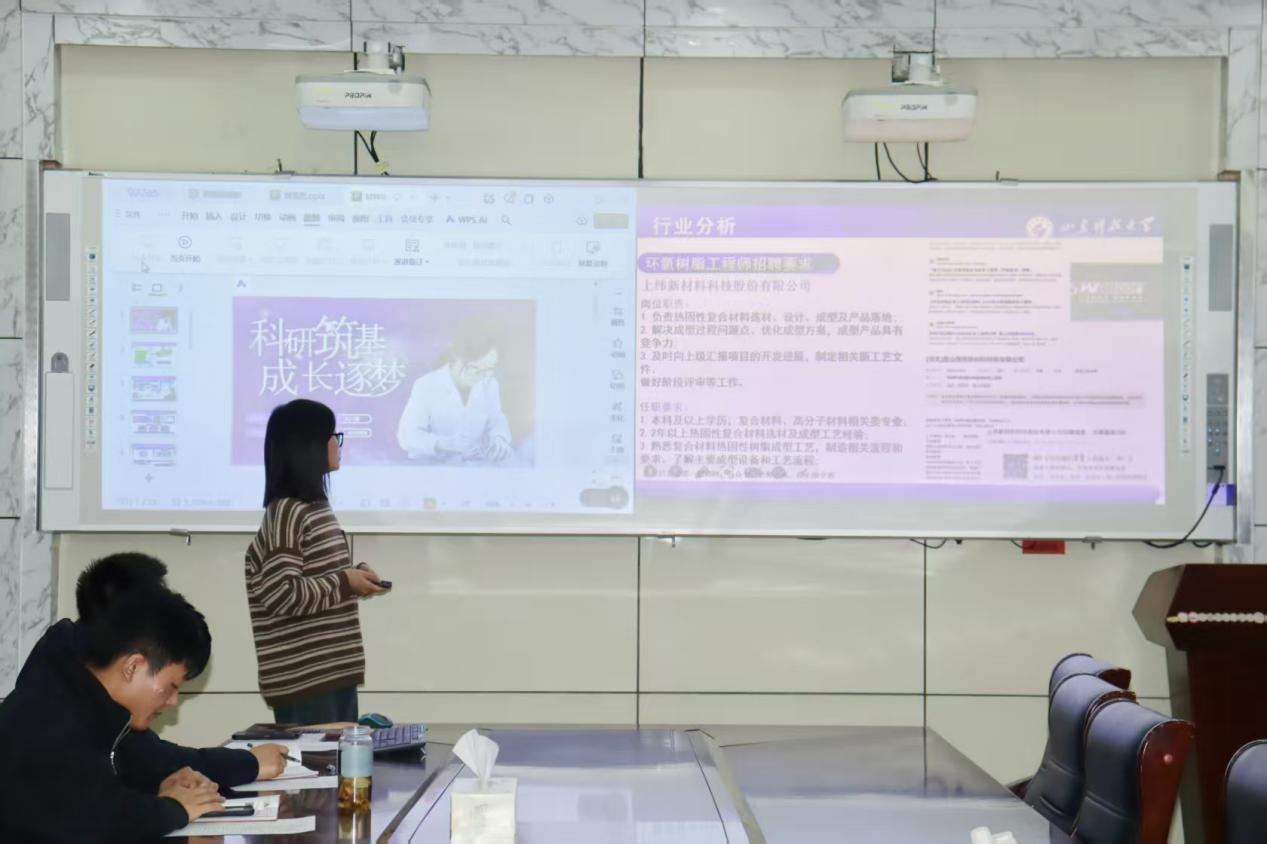 比赛中,参赛学生围绕个人科研经历、技术特长与职业规划展开七分钟左右的答辩,充分展现了对材料领域科技创新趋势的认知与职场适配思考。评委针对选手的方案设计、成果转化表达等核心要点进行提问点评,给出精准指导。