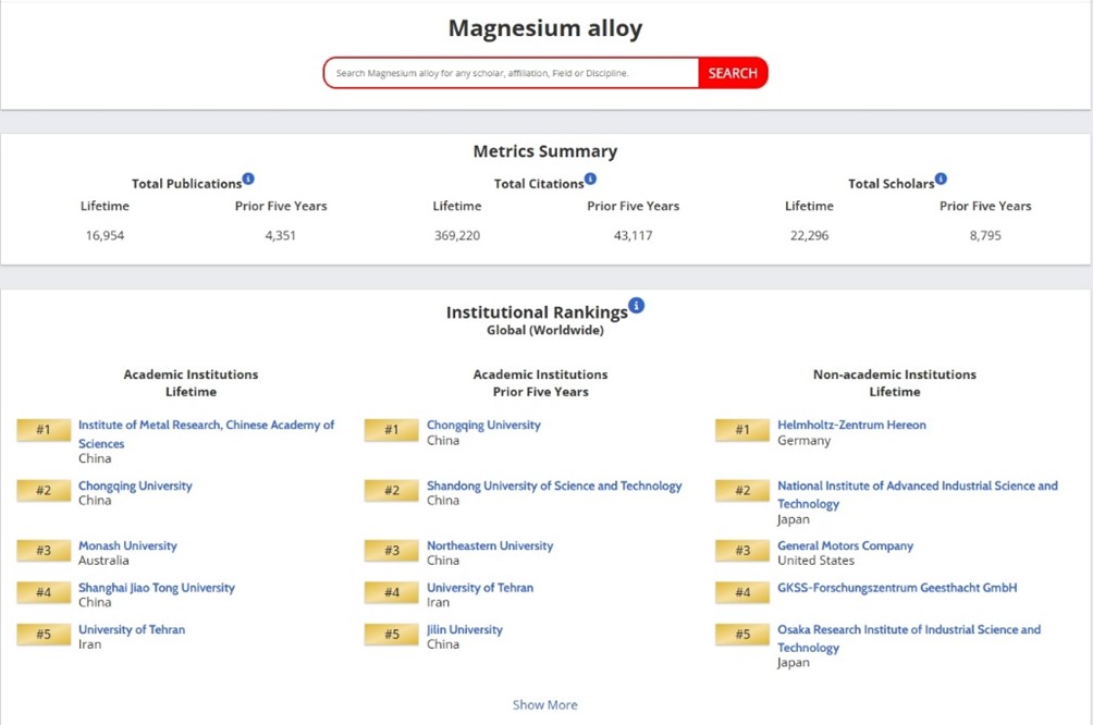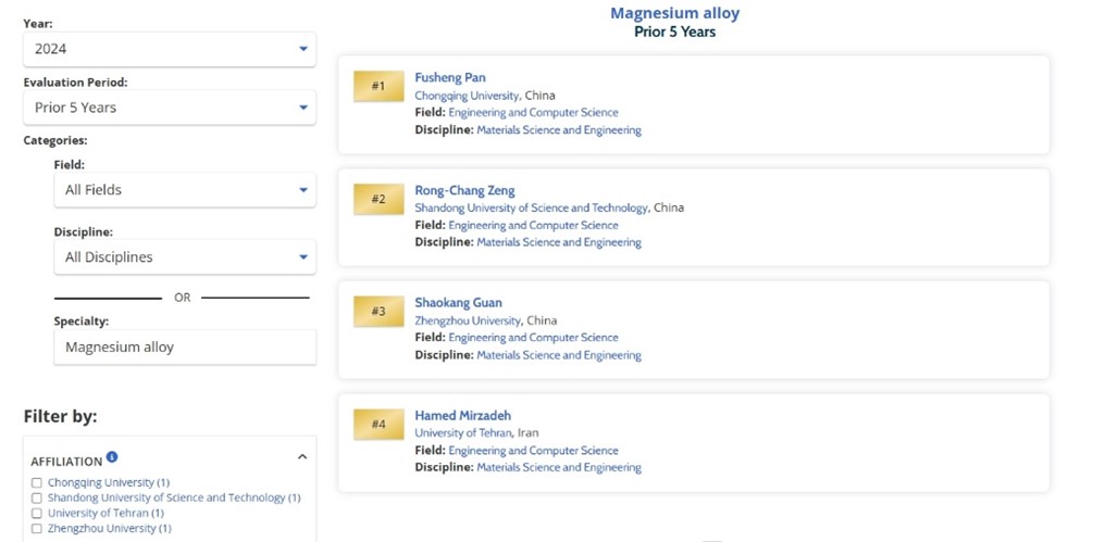 全球入选镁合金领域近5年学者榜单仅4人、机构榜单仅5个。山东科技大学72886必赢曾荣昌教授位列第二位。同时,在镁合金机构排名中山东科技大学同样位列全球第二。