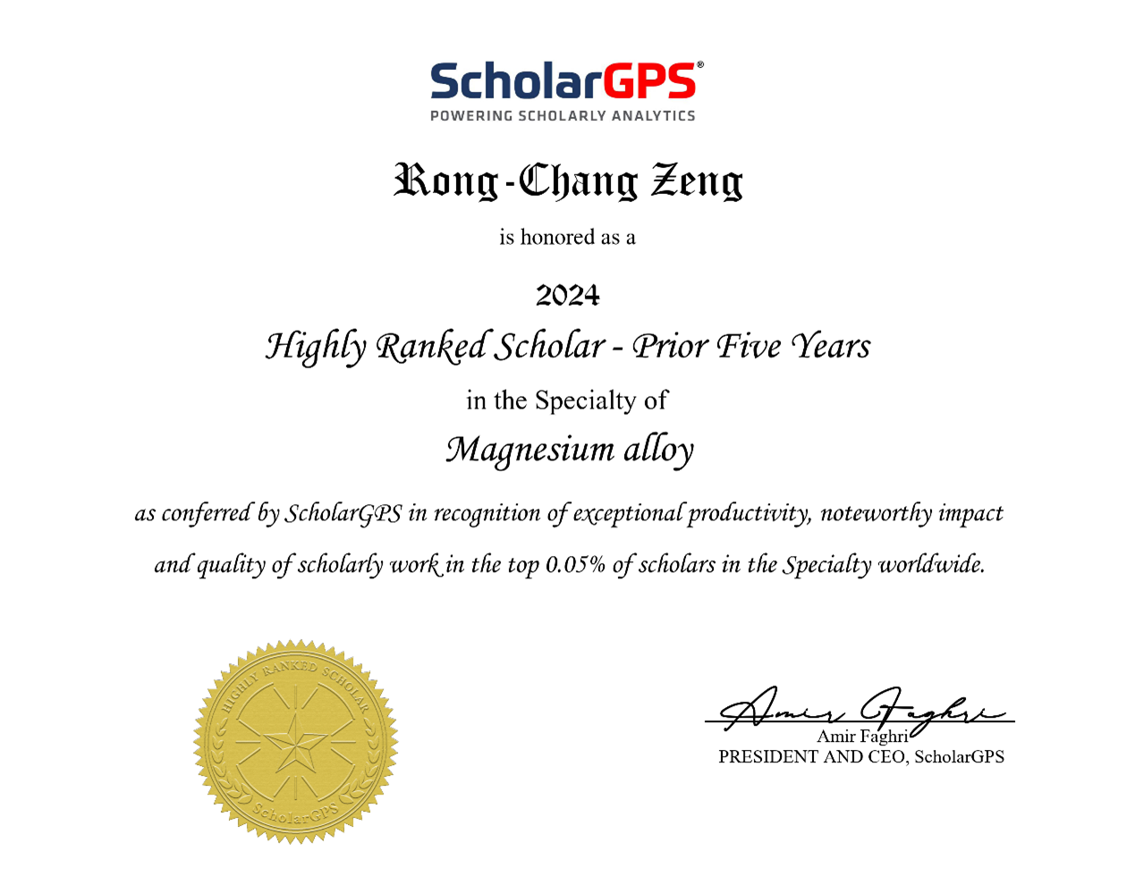 曾荣昌简介:博士、山东科技大学二级教授、博导、国务院政府特殊津贴专家、入选国际先进材料协会会士、全球前0.05%顶尖科学家近5年榜单、全球前2%顶尖科学家榜单和“终身科学影响力排行榜”、爱思唯尔2021-2024中国高被引学者、2024年度中国知网高被引学者Top1%、中国科协中国科技期刊卓越行动计划优秀审稿专家、腐蚀与防护最美科技工作者;中国腐蚀与防护学会四十年贡献奖优秀科研团队负责人;担任中国腐蚀与防护学会医用金属材料腐蚀控制专业委员会第一届主任委员、山东省腐蚀与防护学会副理事长等10多个专业学会理事职务、KeAi期刊《Smart Materials in Manufacturing》副主编、《Bioactive Materials》(IF18.0)、 《Journal of Magnesium and Alloys》(IF15.8)等10多个英文期刊编委。