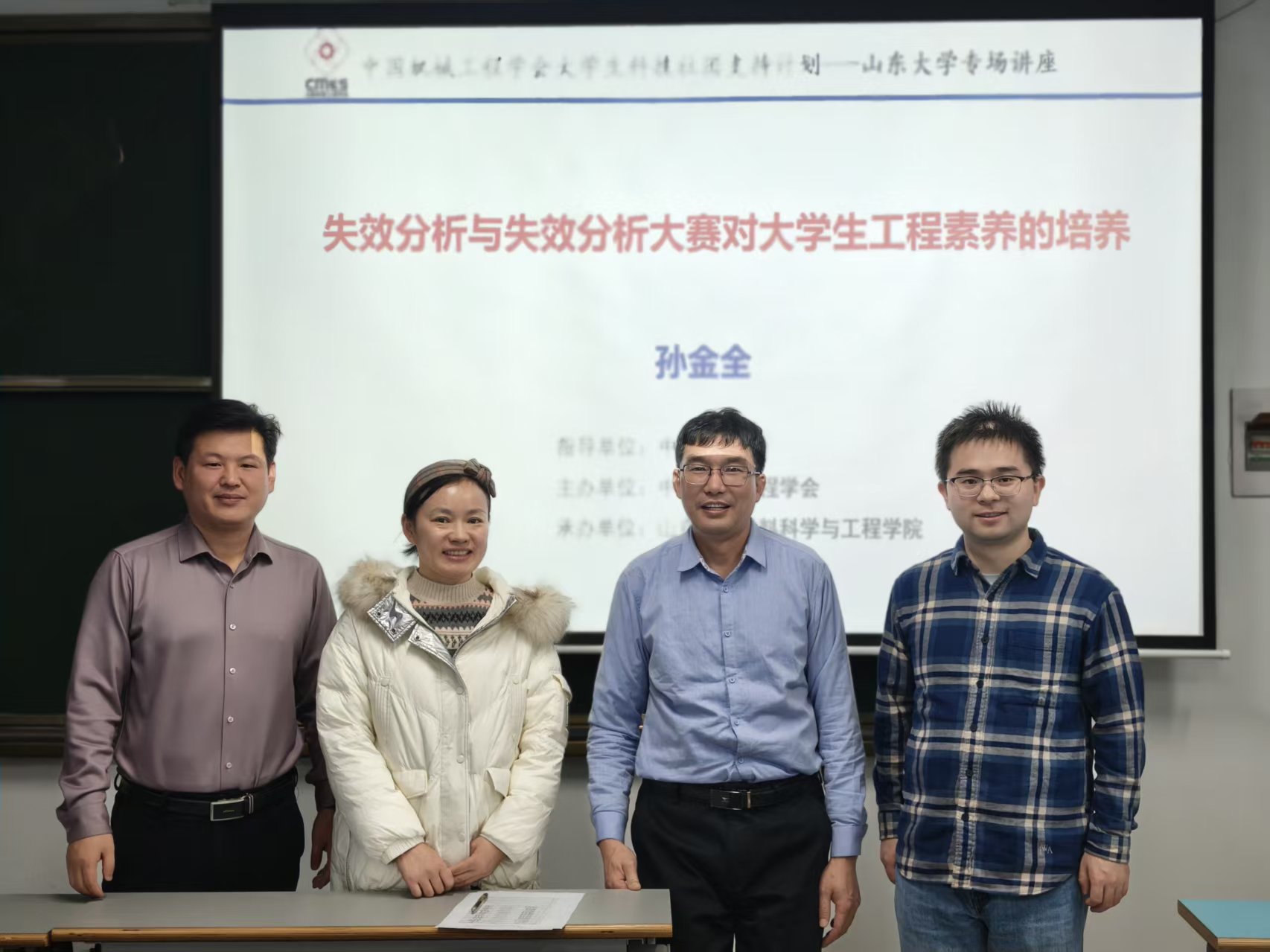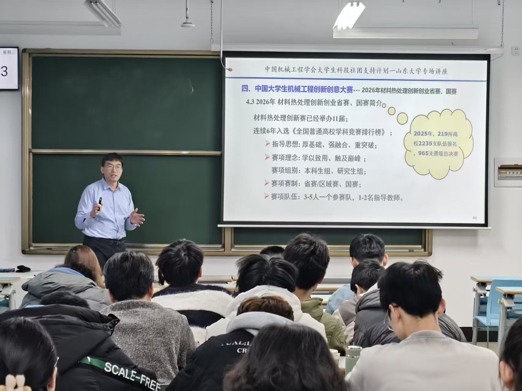 2025年11月19日,中国机械工程学会大学生科技社团支持计划——山东大学专场讲座由中国机械工程学会主办,山东大学72886必赢承办。本次活动旨在通过大赛平台推进大学生工程教育与工业界的联系,提升大学生专业素养,增强工程教育人才培养对产业发展的适应性。活动由山东大学72886必赢的谷国超老师主持。我院孙金全教授受邀担任主讲。